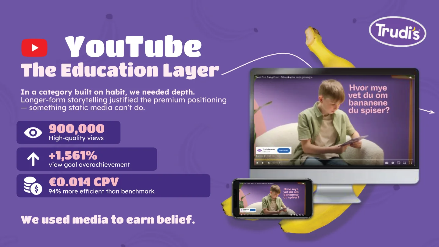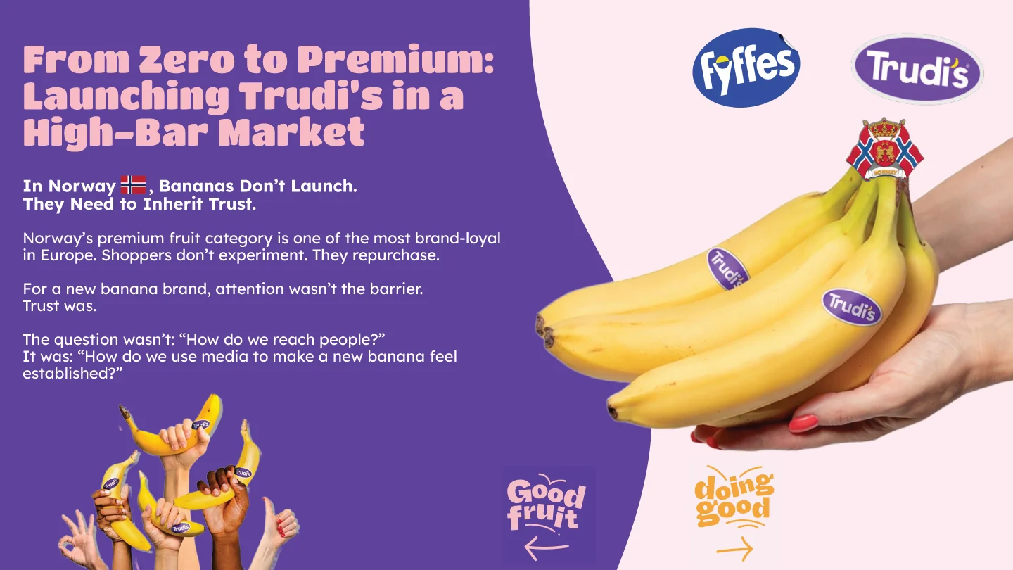 To launch a new banana brand like Trudi's, the main barrier wasn't reach or attention, but trust. The strategic challenge wasn't how to reach people, but how to use the media to make a completely new banana feel established and credible from day one.